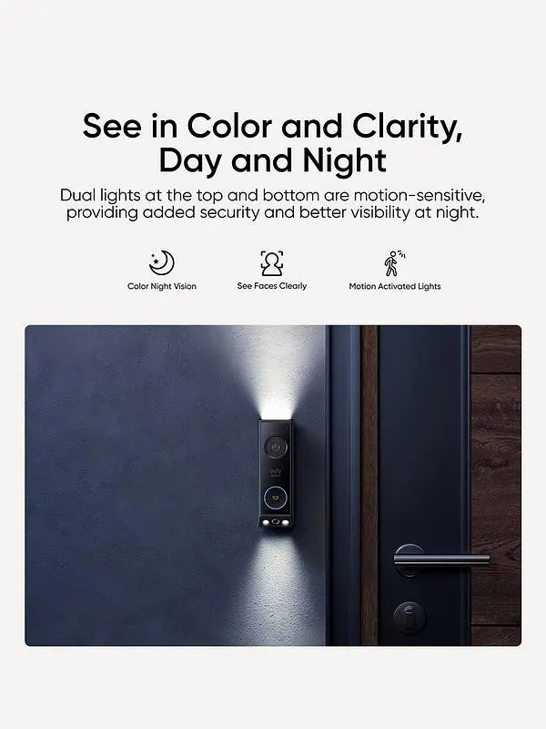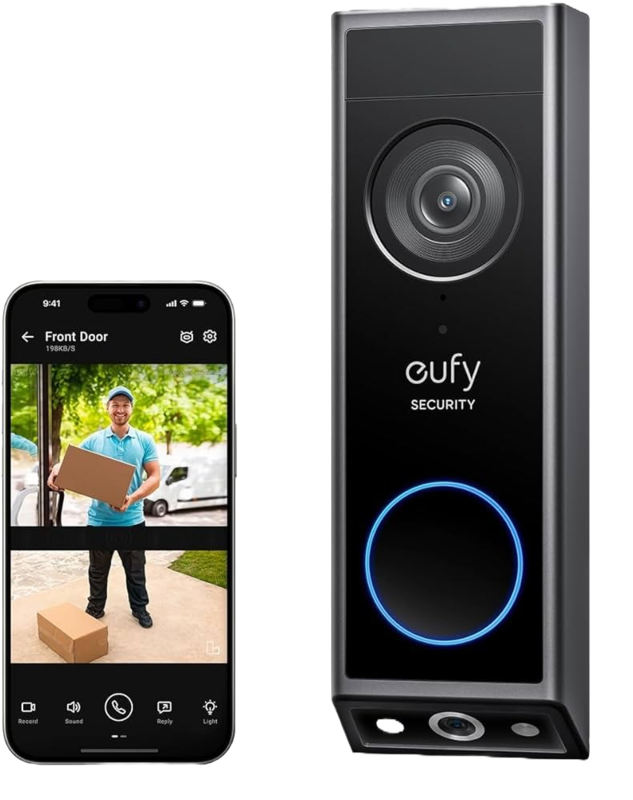 Eufy E340 er snjöll dyrabjalla með myndavél. Þetta er hágæða öryggislausn fyrir útidyrnar. Hún býður upp á 2K myndgæði, er með tvær myndavélar og nætursjón – þannig fer ekkert framhjá þessari dyrabjöllu án þess að þú vitir af því. Hægt er að beintengja hana eða nota með rafhlöðu.